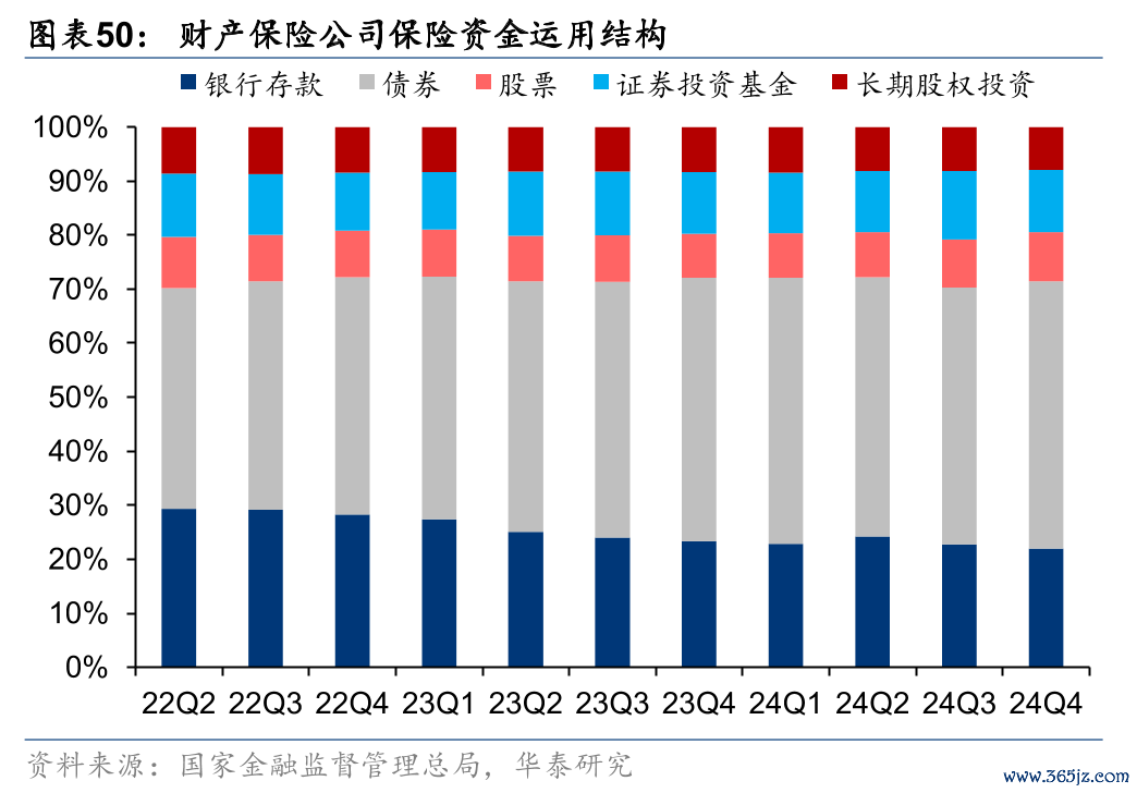 截至24Q4末,保险资金运用余额达33.26万亿元,同比+15.08%(当季余额和同比均不含部分风险处置机构)。结构上看,财产保险公司银行存款、债券、股票、证券投资基金和长期股权投资占比分别为17.37%、39.14%、7.21%、9.12%、6.26%,人身险公司银行存款、债券、股票、证券投资基金和长期股权投资占比分别为8.42%、50.26%、7.57%、4.93%、7.77%,无论人身险公司还是财产保险公司,对债券和股票的投资较Q3均有增加。